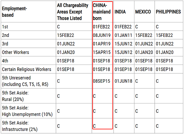 EB-1类别(EB-1A、EB-1B、EB-1C)5月排期不变,仍然是2022年2月1日。