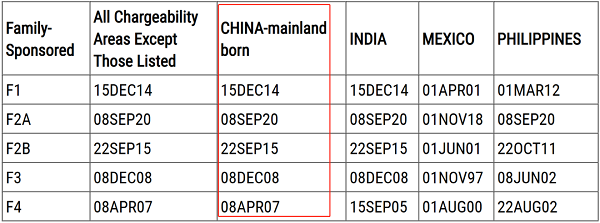 F1(公民的21岁以上未婚成年子女):2023年5月排期前进了14天,到了2014年12月15日。