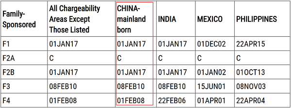 F1(公民的21岁以上未婚成年子女):2023年5月排期前进146天,到了2017年1月1日。
